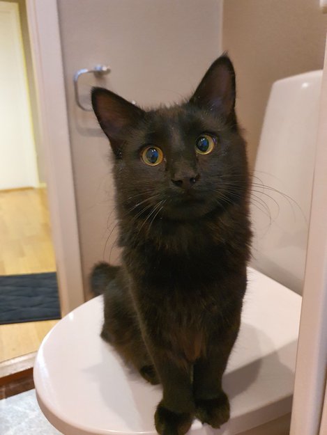 Sort katt med noe lysere partier på magen og fremme mellom bena.
