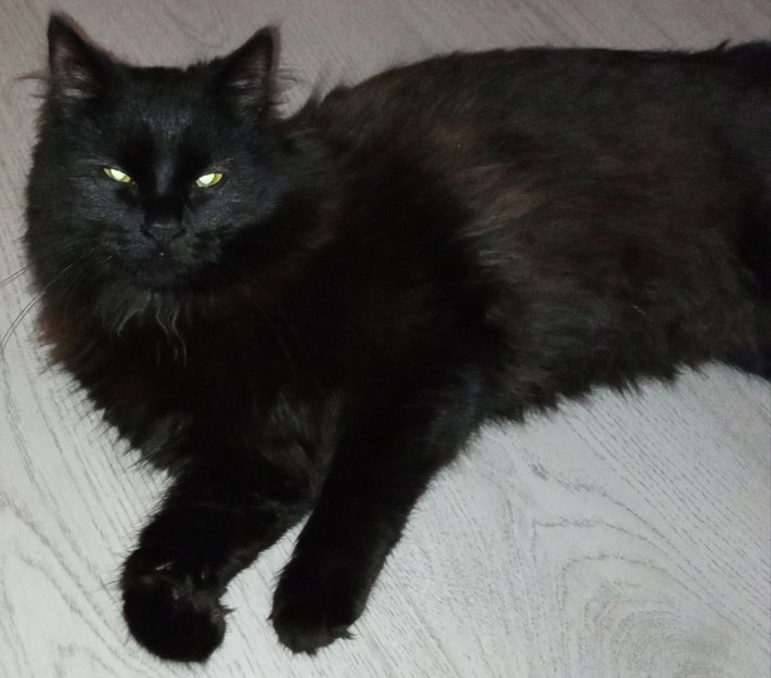 Han skinner litt brunt under haken han er langhåret og svart er ikke veldig sky er også langhåret