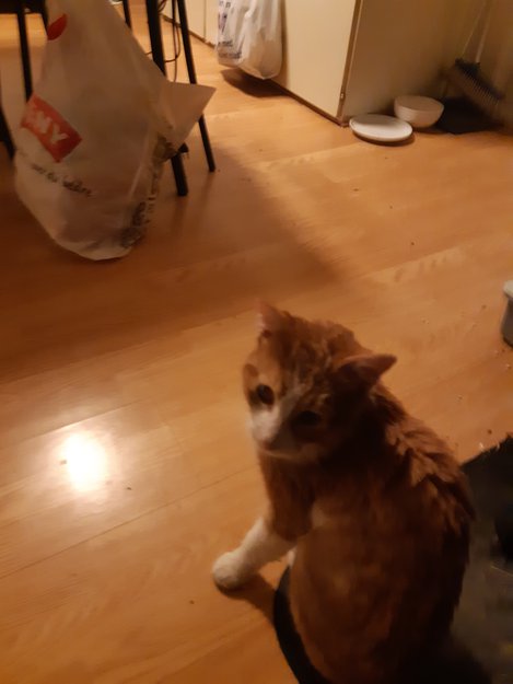 Blind på høyre øye, ser ut som en gammel skade.. går på kattedo og mere opptatt av kos en mat... Forfølger meg konstant og virker som er redd for å bli forlatt... Søker veldig nærhet og vil ligge i fanget hele tiden..