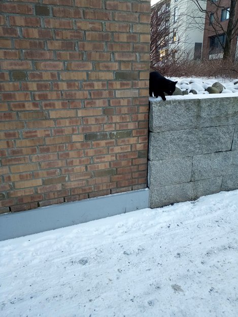 Jeg har sett denne katten krysse gaten veldig fort, så det er farlig fordi det er mange biler som kjører fort også. Denne katten har en ensfarget svart farge og ser ut som grønne øyne, men jeg kan ta feil med øynene. Han/hun ser frisk ut. Kjenner du igjen katten din?