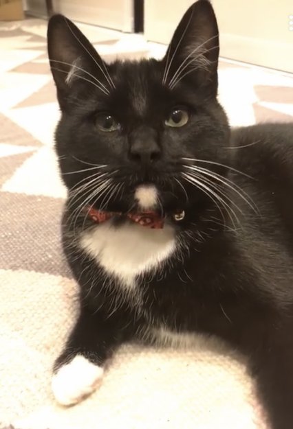 I bildet har han på seg en liten sløyfe men tror ikke han hadde den på seg da han dro ut sist.
