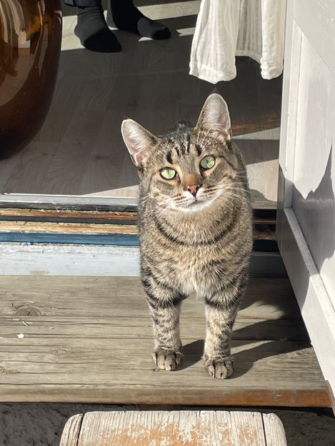 Hannkatt, snart 5 år. Grå og svartstripet med gyllenbrun undertone. Noe hvitt under munnen. Grønne øyne. En liten pigg på toppen av hodet, litt ut mot den ene sida. Sky, siden han ikke er vant med andre mennesker og tidligere har gått ute i flere år. Livlig, kjapp og spenstig.