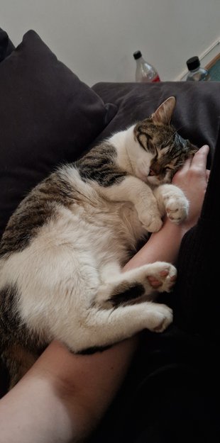 Blir 2 i sommer, kastrert og chippet. Rister på halen om han vil kose, veldig lett på tå - så ikke lett å høre om han sniker seg inn i evt boden bak deg, noe nervøs og takler ikke bli løfta opp.