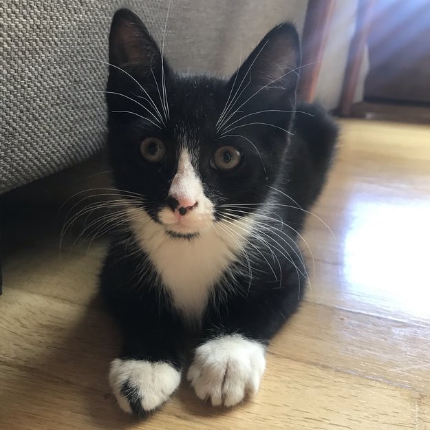 Svart med hvite poter. Svart flekk på ene frampoten. Svarte flekker på nesa. Hvit under magen og på brystet.