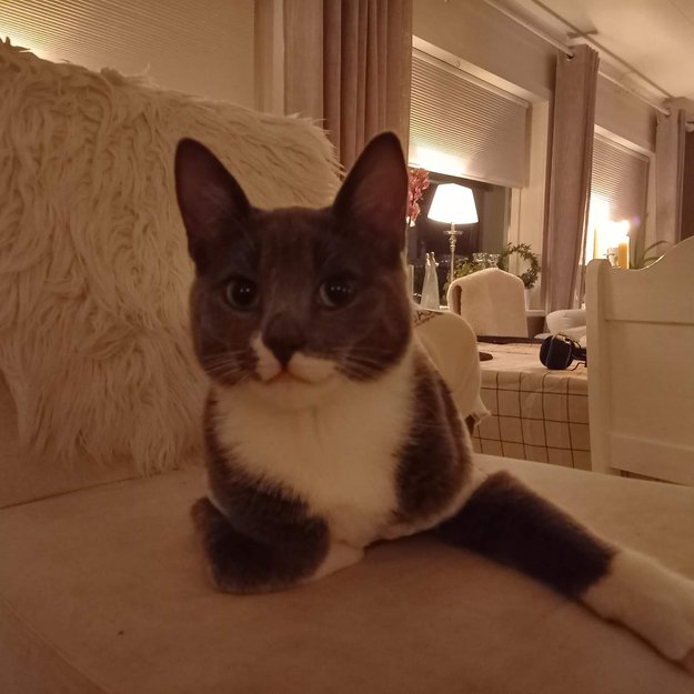 Grå og hvit. Blå øyne, noen ganger grønnaktige. Korthåret. Masse energi, uredd, leken. 7 måneder gammel hannkatt, er blitt ganske lang men ikke tjukk. Veldig grei, Masse energi, uredd, leken. Spesiell mjauing.