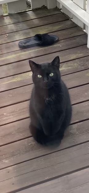 Har helt svart pels og store grønne øyner. Bitte litt av hvit hår på hals