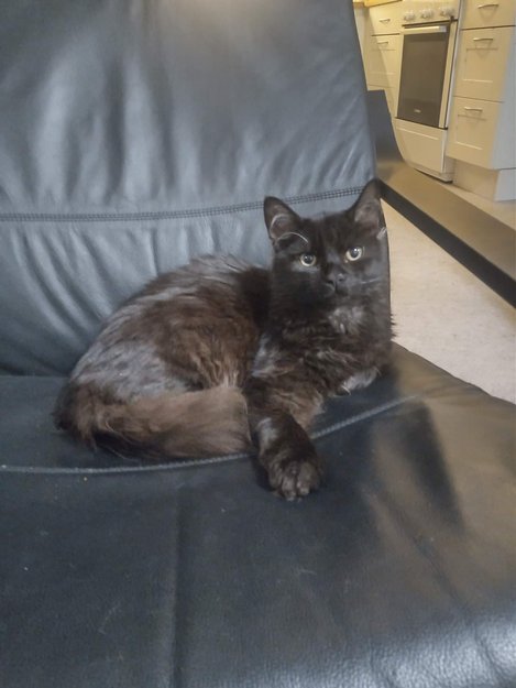 Bønna er en svart langhåret skogskatt med grå dusker bak ørene. Det var ikke mulig å kastrere den da jeg hadde den hos veterinæren siden testiklene trolig er oppi magen. Han er chippet og registrert hos Koba Vet Kristiansand som er veterinæren hans. Han var nå et halvt år, og chippet, så jeg valgte å slippe den ut litt gradvis. Det funket fint noen dager, men i går kveld gikk han ut og siden har jeg ikke sett den. Har snakket med naboene, lett overalt og ropt og gått rundt overalt. Ingen tegn til Bønna mi. Han er helt uerfaren og bare 1/2 år. Håper han snart kommer tilbake. Ring meg hvis du finner en svart tass med grå områder i ulla under og grå dusker bak ørene.