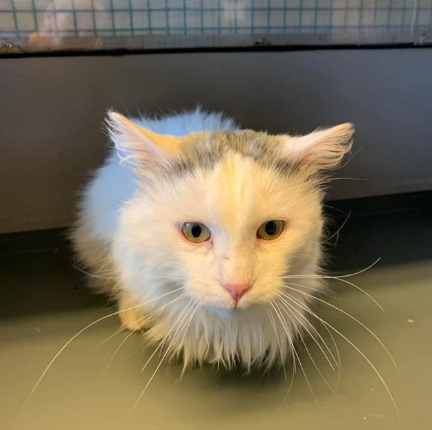 Hvit langhåret med litt grått på hodet. Er ca 2 år. Er ikke id-merket eller kastrert.