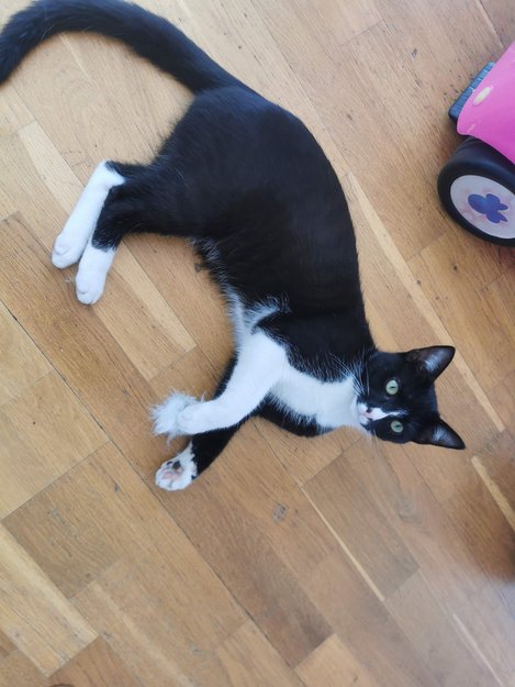 Han har en hvit stripe som begynner i pannen og slutter på den ene poten. Ellers så er han svart og hvit. Rosa nese.