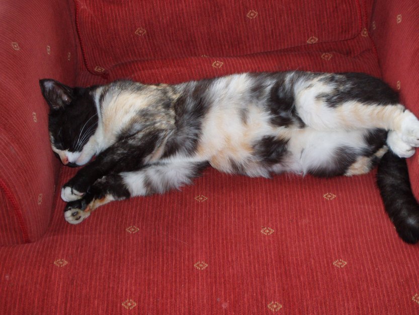 Ho er veldig liten til å være en voksen katt på snart 9 år, er veldig nyskjerrig og kosete. liker nye mennesker. ho har de samme fargene fjeset som på kroppen. i pannen er ho orange og svart, svart rundt øynene og ned mot nesten har ho en liten hvit flekk.
