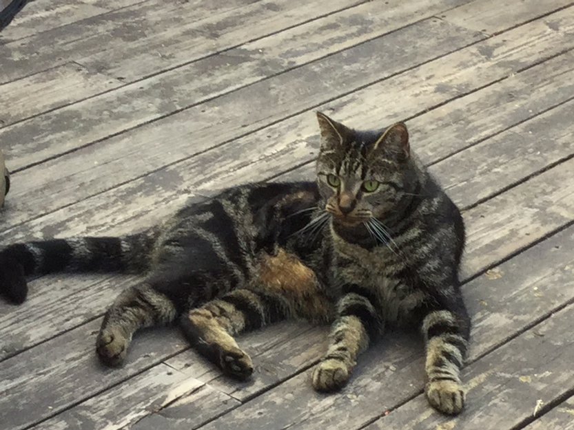 Ganske mørk og brede striper. Ujevne striper. Nesten sort over ryggen. I godt hold etter mye kosing inne i vinter. Litt tilbakeholden med fremmede. Lysebrun mage, med «pelsdusk». Snart 4 år. Bor sammen med to andre katter.