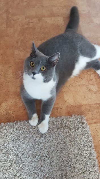 Katten vår er grå og hvit. Ho er hvit på halsen og har grønn øyefarge med sorte pupiller.