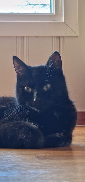 Hun er svart men hun har litt brun eller rød stripete når du ser på lys. Hun er gravid jeg tror.