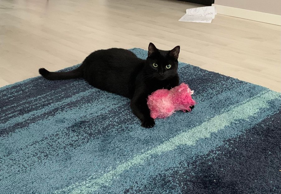 very friendly, litle bit frighten, used to spend days outside. She has a few white hairs on her chest