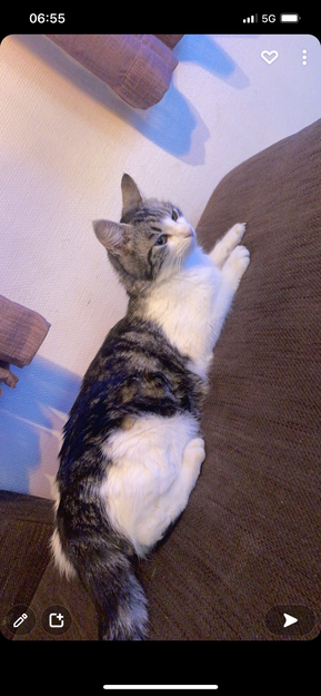 Hun har kattunger i magen så hun er ganske "stor" hun er grå, svart og hvit.