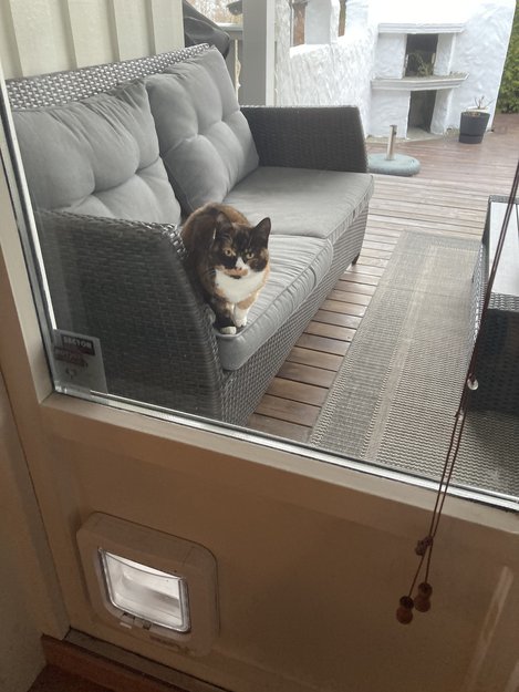 Kom på døra og vil inn. Ligger på utesofa og venter på å slippes inn.