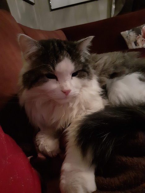 Stor hannkatt. Er chippet og kastrert, har på et flåtthalsbånd.