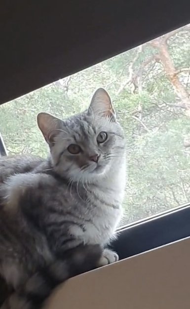 Ser ut til å være en kattunge, grå-stripet og sorte «strømper» på bakbena. H*n får komme og gå som den ønsker hos oss frem til vi finner eiere.