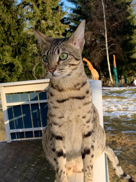 Hun er ganske blyg når det gjelder fremmede mennesker. Hun er en grå og hvit katt med svarte striper og prikker. Hun er en ganske stor katt, med veldig store ører. Hun har grønne øyer og en rosa nese.