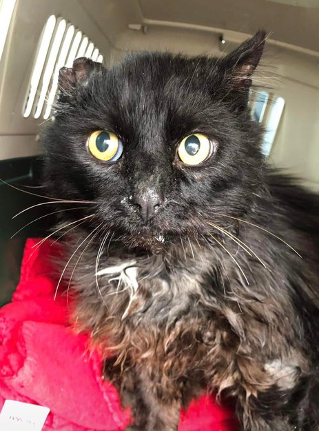Svart semi langhåret skipskatt funnet på Hauganfjæra Camping på Frosta. Preget av å ha gått ute en stund.