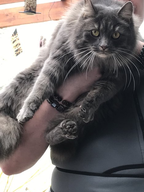 En grå (muligens hunkatt) som har oppsøkt oss over flere dager og nå har tatt omtrent permanent opphold på vår veranda..