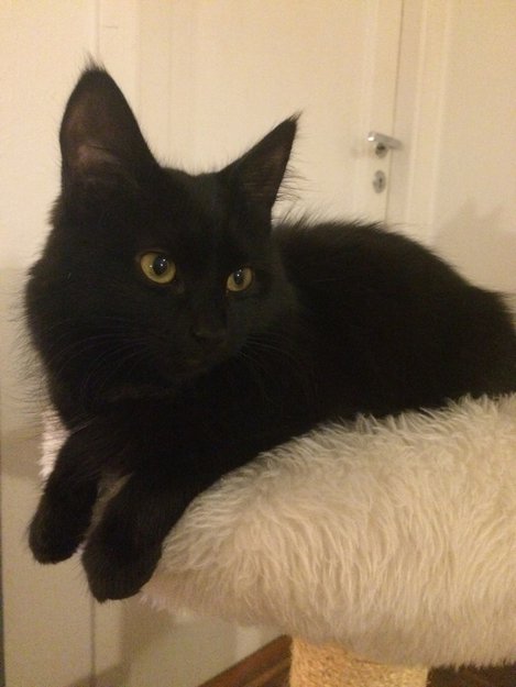 Langhåret, helt sort men med en gråhvit bust på halsen.