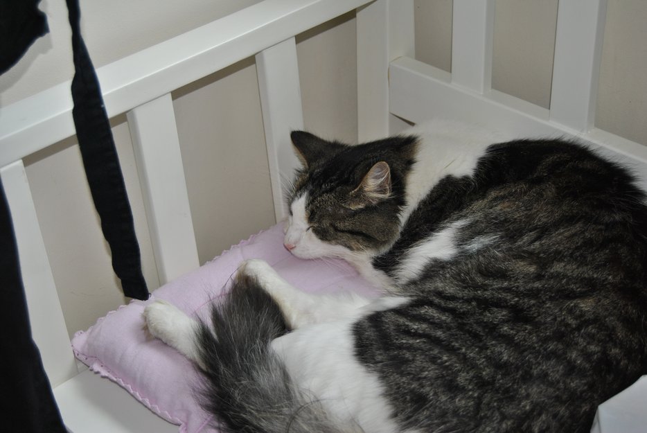Hvit & de mørke feltene er spraglete...Utrolig tillitsfull & kosete. Sover godt når han får komme inn:)