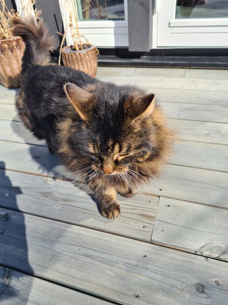 En nydelig langhåret katt, trolig hunnkatt, har flyttet inn i garasjen min. Hun ble først observert rundt den 05 april. Hun er veldig kontaktsøkende, men litt skvetten.