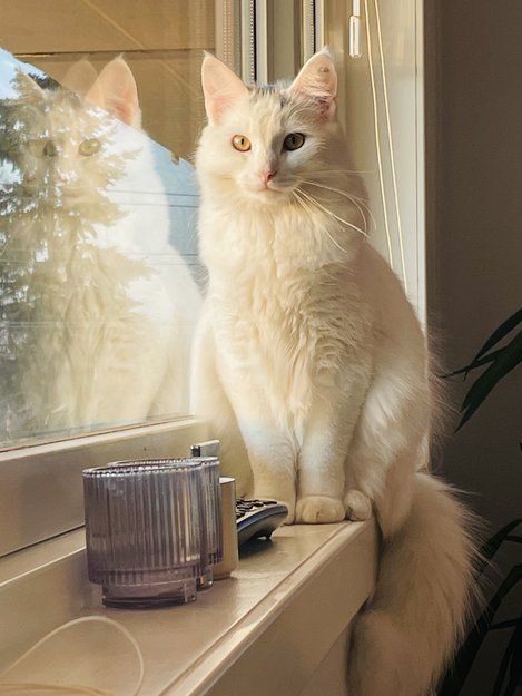 Lite kortare päls än en norsk skogskatt, helt vit, med en grå fläck på huvudet (mellan öronen).