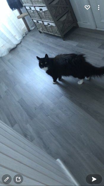 Hun lyder Pushin og er ikke så lett å komme i kontakt med, hun er mest kjælig med meg som eier. Svart pels med hvite poter, mage og hals. Hun bruker aldri å være borte, så savnet er stort!