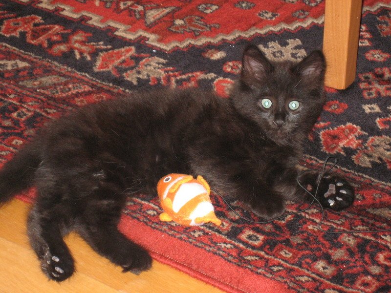 Mørk grå, litt langhåret. Hvit flekk på halsen, tuster i ørene.