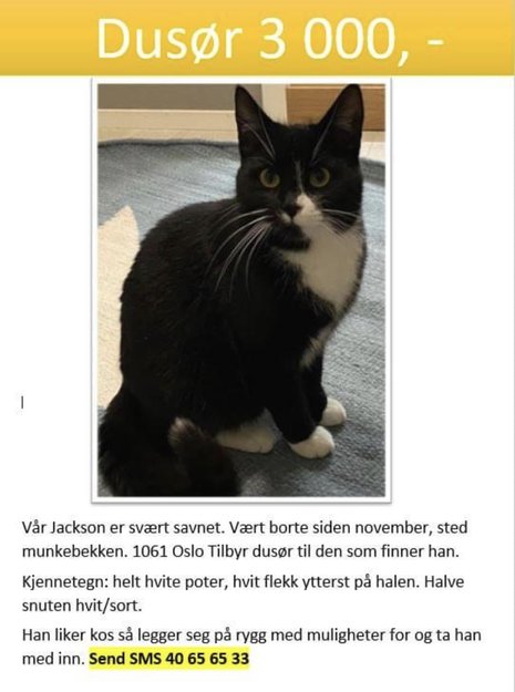 Jackson kom ikke hjem igjen etter sin vanlige kveldstur. Han er enormt savnet. Så vi lever fortsatt i håpet om at han kommer hjem igjen snart.