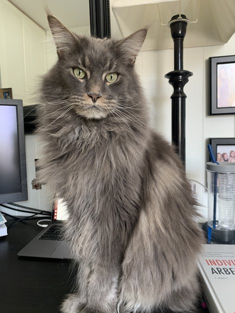 Stor katt på 7 kg. Har ID-merke i nakken, og har et grått flåtthalsbånd rundt halsen.