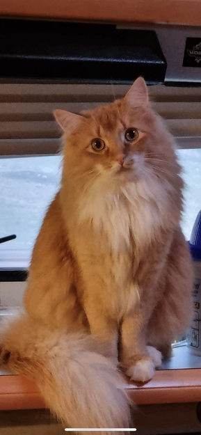 Gutten er barbert rundt halen og opp på ryggen etter en slosskamp med annen katt. Han er veldig rolig og lager ikke mye lyd. Han har litt hvit tupp på halen og er hvit under haken/på brystet. Hvite sokker på alle poter også.