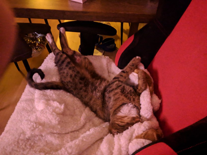 Har svarte striper langs ryggen. Svarte prikker på kroppen og hvit mage. Veldig energisk. Har to sår på bakbeina som ho har slikket selv.