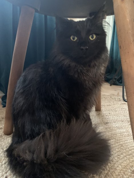 Stor svart katt med lang pels. Litt innslag av brunt og grått i pelsen, særlig rundt halsen og på magen. Han kan være litt sky men er veldig kjælen og glad i folk. Ute kan han nok fort springe og gjemme seg, men er tillitsfull når man lokker på han.