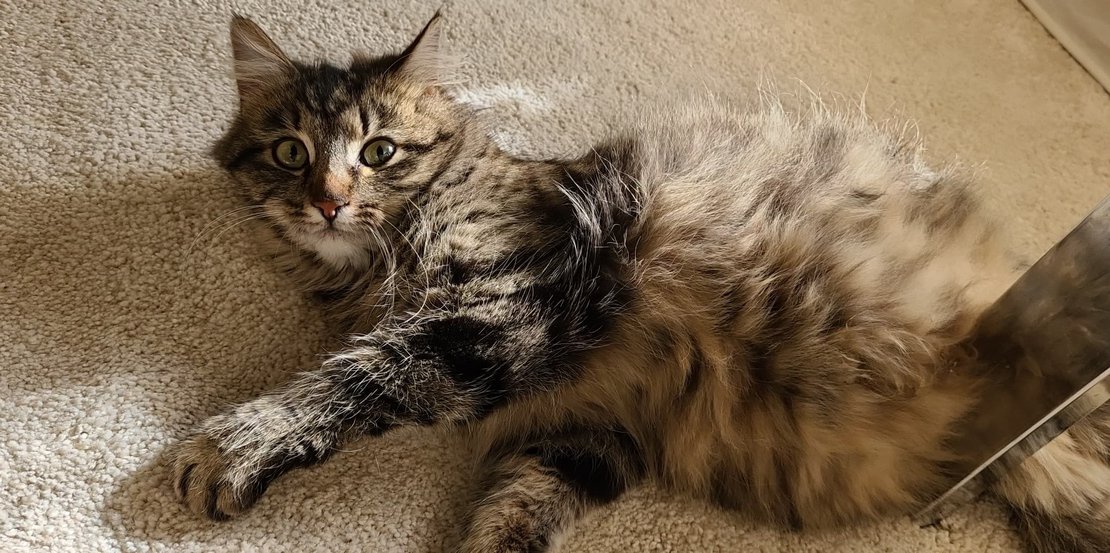 Semi-langhåret bruntigret, litt hvitt/lys beige under haken. Sorte tær. Liten, slank. Ca 1 år gammel, ikke kastrert og ikke chippet.