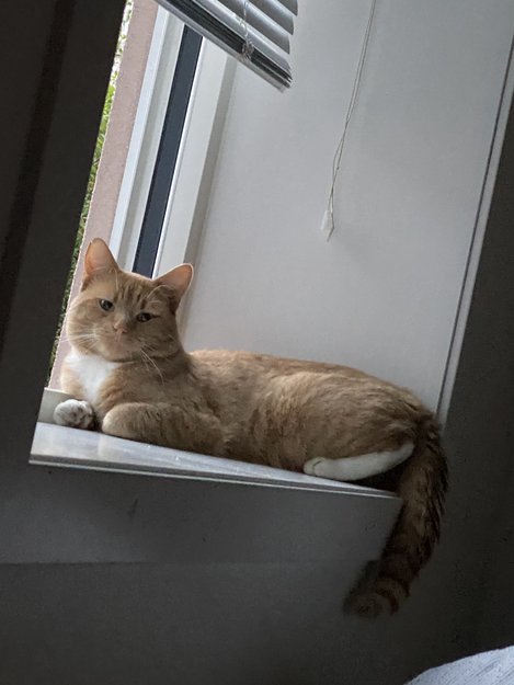 Han er oransje og hvitt både i halsen, magen og beine hans. Han er litt redd av mennesker. Han er ikke så stor. Det er hann katt.