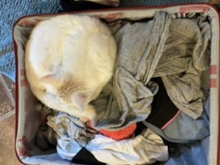 Katten er 11 mnd, hvit med litt symmetrisk aprikosfarge på toppen av hodet. Gule øyne. Kosete og hengiven mot oss, skeptisk til fremmede..