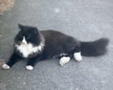 Basse er svart med hvite poter og bryst. I tillegg har han en stor og kraftig hale. Vi savner han veldig mye