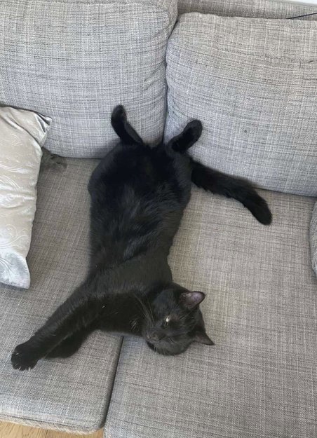 Grønne øyne, stor, svart, et par hvite hårstrå på brystet, ukastrert, ikke chippet.