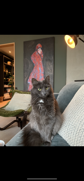 Hun er grå og halvlang i pelsen med fluffy hale. Har en hvit flekk under halsen. Liten katt/medium i størrelsen.