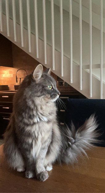 er to nyanser av grå, mørkere på ryggen, lysere på brystet. Begge potene bak er hvit, har en fluffy hale, litt barbert på begge frambein og hals etter blodgivning noen uker tilbake. Går med bakbeina litt utover, da hun er hyperflexibel i bakbeina, påvist patella, har gule øyne.