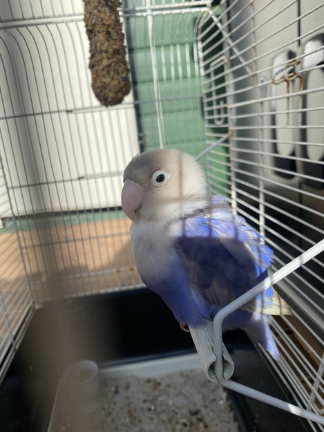 Hvitt/grått hode, blå kropp med noen grå fjær. Har ringmerke.