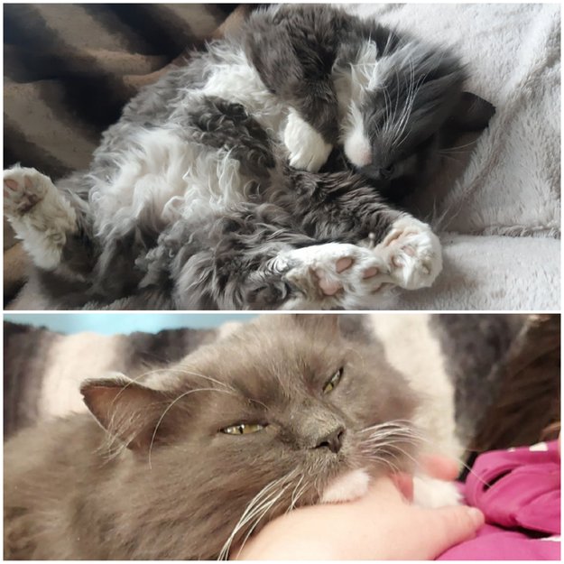 Grå og hvit langhåret katt. Hann fikk løveklipp i desember så pelsen er ikke helt ferdig utvokst i full lengde. Krøller i pelsen på magen. Brun flekk på høyre øye. Kosete, Maler mye og høyt, men mjauer nesten aldri og lavt. Hvite værhår, men mangler dette over venstre øye.
