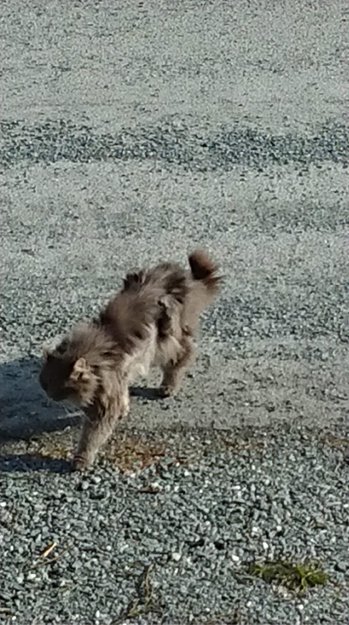 Grå langhåret katt. Virker litt sky.