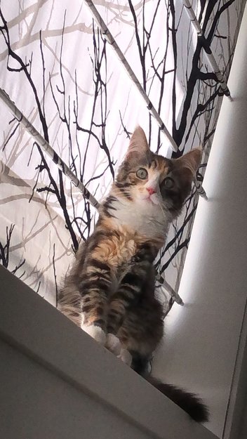Hun er veldig sjenert og tilbaketrukken litt red for fremmede. Hun har spraglet pels og er ca 9/10 måneder. Hun har ene siden av våtlinjen på øyet lyserosa og andre sort. Hun har grønne øyne.