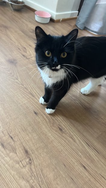 Hun er svart og hvit, som på bilde ser man at hun er hvit den ene siden opp til nesen.