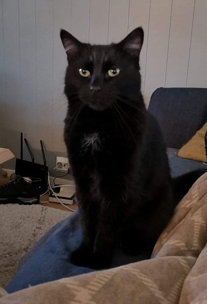 Sort hannkatt med en liten hvit flekk på brystet. Han har også et par andre hvite hår i fjestet som ikke er så synlig. Han er ganske sky for fremmede, og vil som regel unngå folk han ikke kjenner godt fra før. Den svarte pelsen blir mer mørkebrun i sterkt sollys.