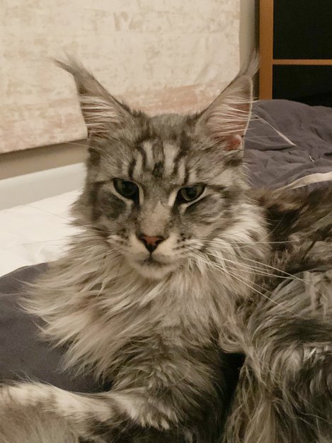 Sølvsvarttabby Maine Coon katt med gule øyne, ca. 6 kg. Hadde et hvitt GPS halsbånd på seg da hun forsvant.
